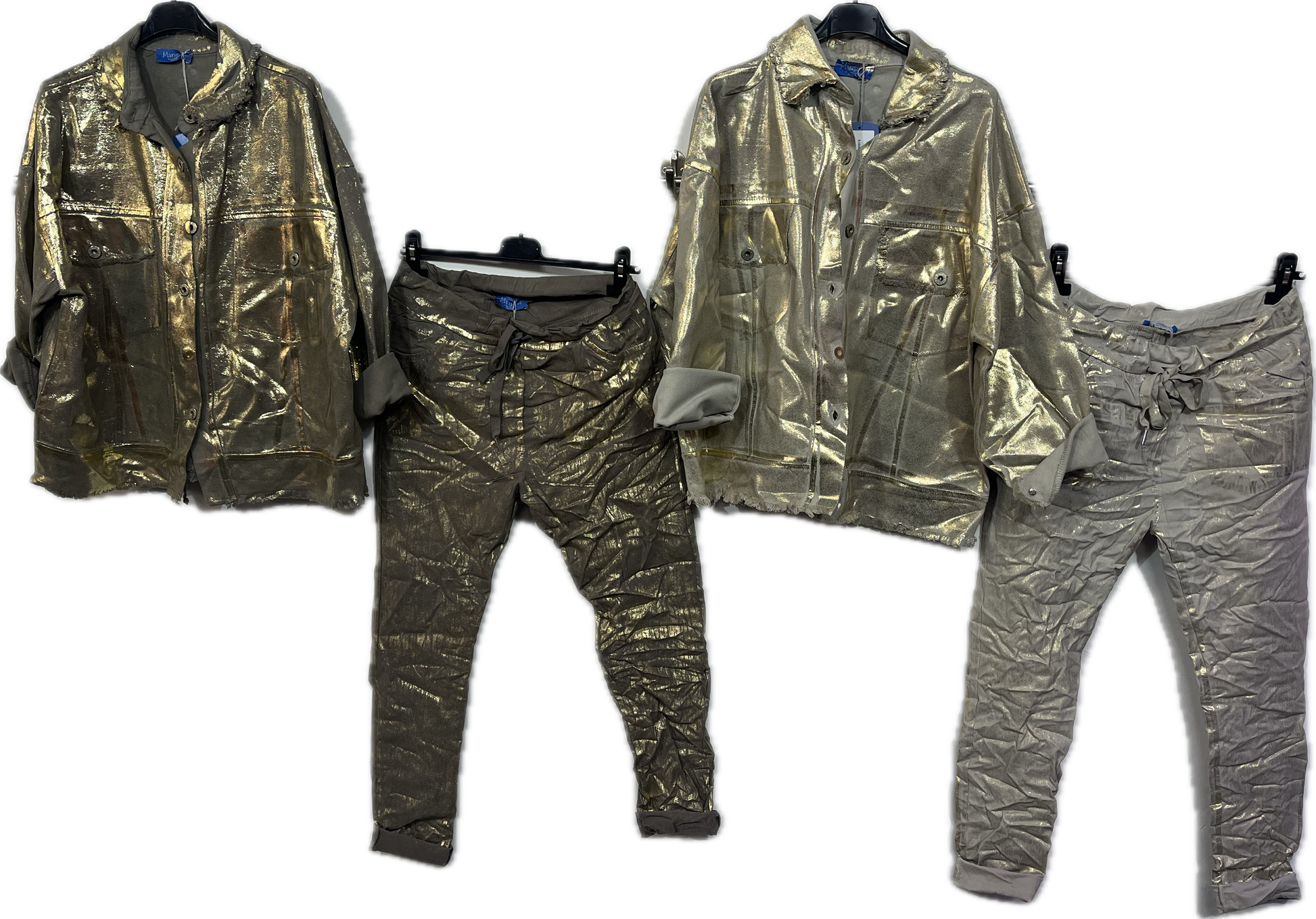 This Button Down Jacket with Gold Foil is made with 100% cotton for a comfortable fit. Its elegant gold foil detail adds a touch of style, and it pairs perfectly with our matching stretch pants. This jacket is a must-have for any fashion-forward wardrobe.
