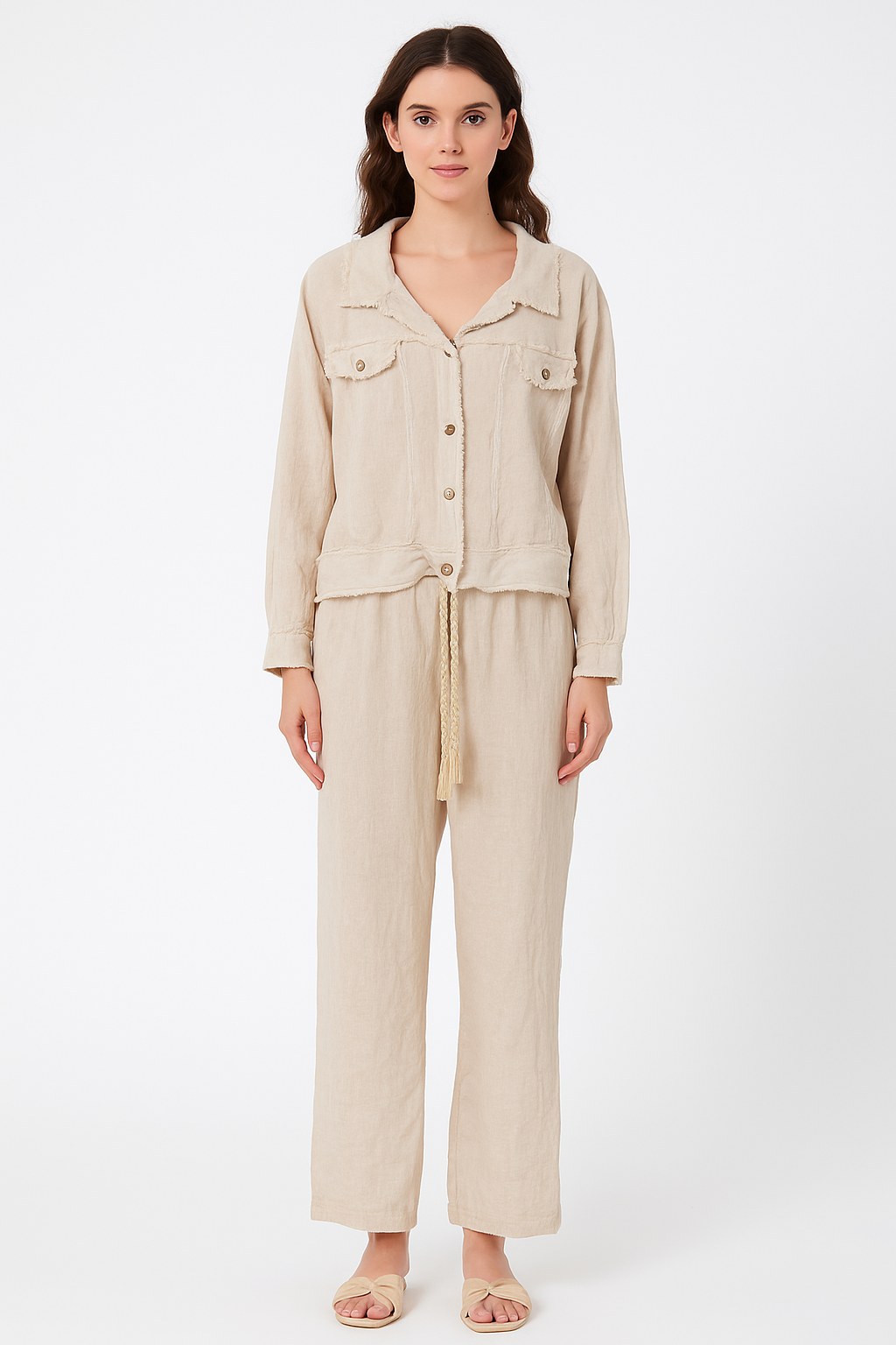 Crafted from premium linen, this button-front jacket seamlessly transitions from casual to refined settings. The structured silhouette and functional pocket detailing deliver both practicality and contemporary style. Breathable fabric ensures comfort throughout the day, while the neutral palette pairs effortlessly with your existing wardrobe. An essential layering piece that elevates any ensemble with understated sophistication.